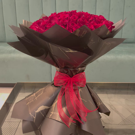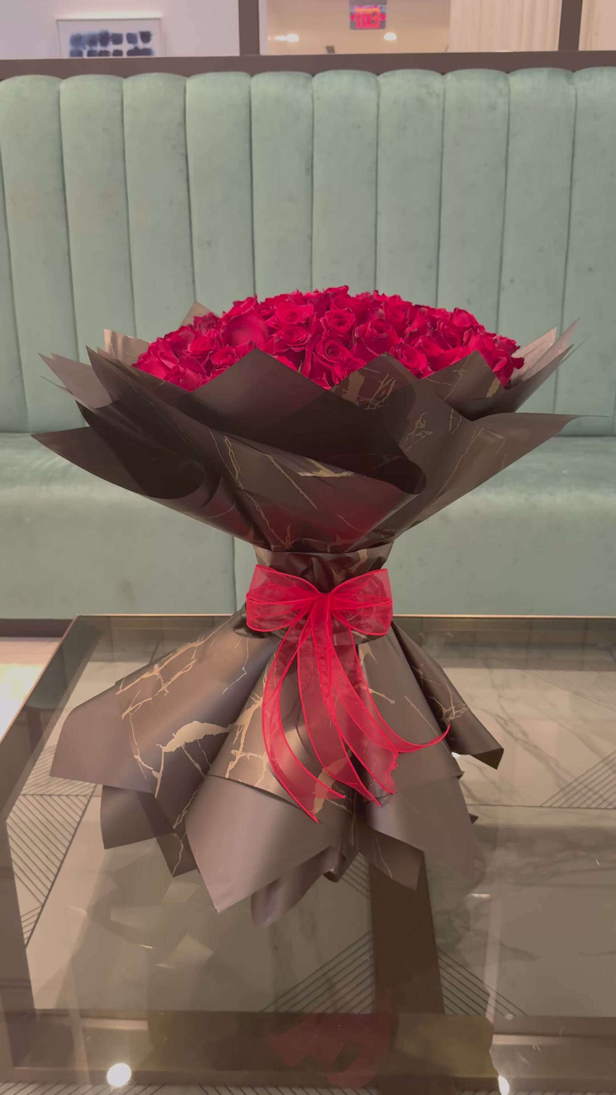 This stunning round bouquet of 75 fresh red roses features rich, deep red blooms arranged in a perfectly compact and harmonious design. The bouquet is wrapped in luxurious black paper with subtle gold marble accents, creating a sophisticated contrast that highlights the intensity of the roses. Finished with a delicate red organza ribbon, this bouquet is a timeless expression of love, passion, and elegance—perfect for unforgettable moments.