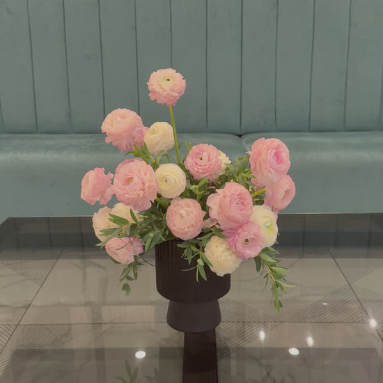 The flowers rest in a matte black ribbed ceramic vase, whose vertical texture adds depth and contemporary sophistication, creating a striking contrast against the tender pastel petals. This combination of textures —the silky layers of ranunculus and the structured ridges of the vase— brings a tactile harmony that feels both serene and luxurious.