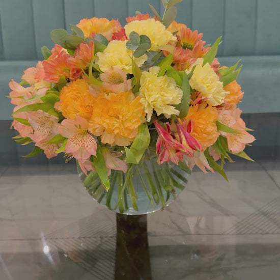 This elegant arrangement in a round base features beautiful carnations, baby carnations, eucalyptus, and alstroemeria, creating a harmonious blend of colors and scents. carnations symbolize admiration and heartfelt love, while baby carnations represent innocence and purity. Alstroemeria, known as the flower of friendship and prosperity, adds a vibrant touch, inviting hope and joy. The eucalyptus, with its fresh and calming fragrance, wraps the bouquet in an aura of tranquility.