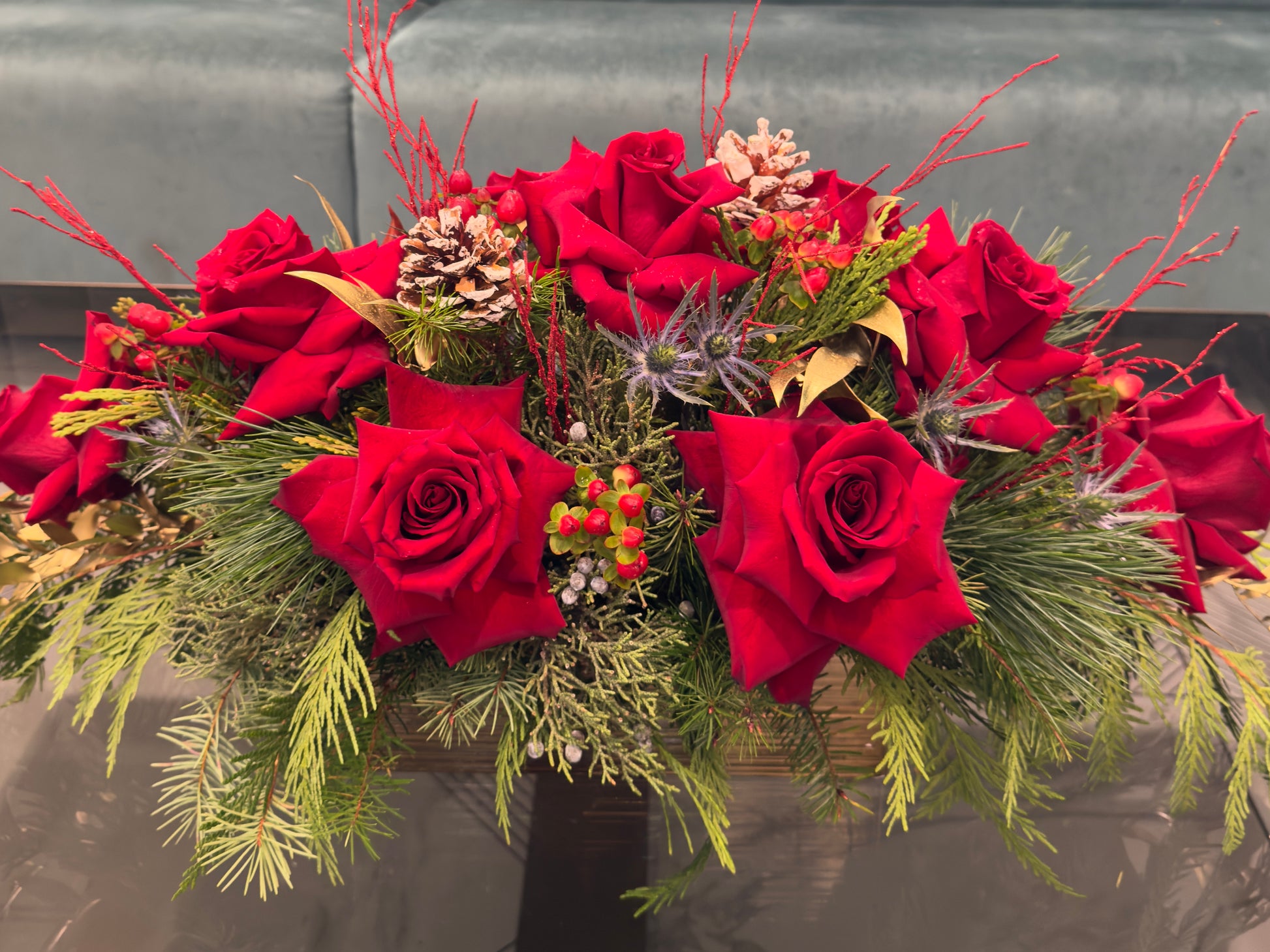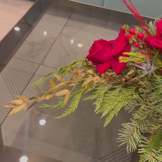 A refined Christmas centerpiece featuring lush red roses, fresh pine greenery, natural pinecones, and subtle golden accents. Designed to bring warmth, sophistication, and festive charm to your Christmas dinner table.