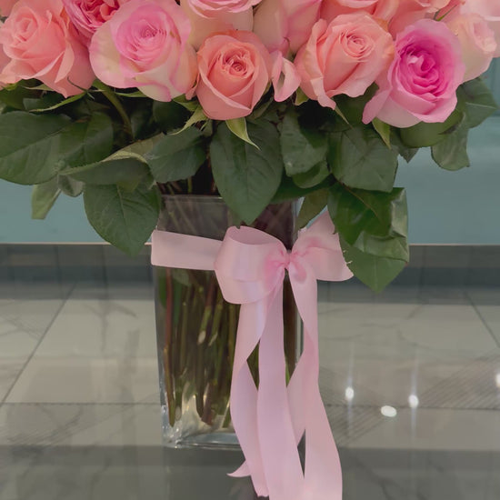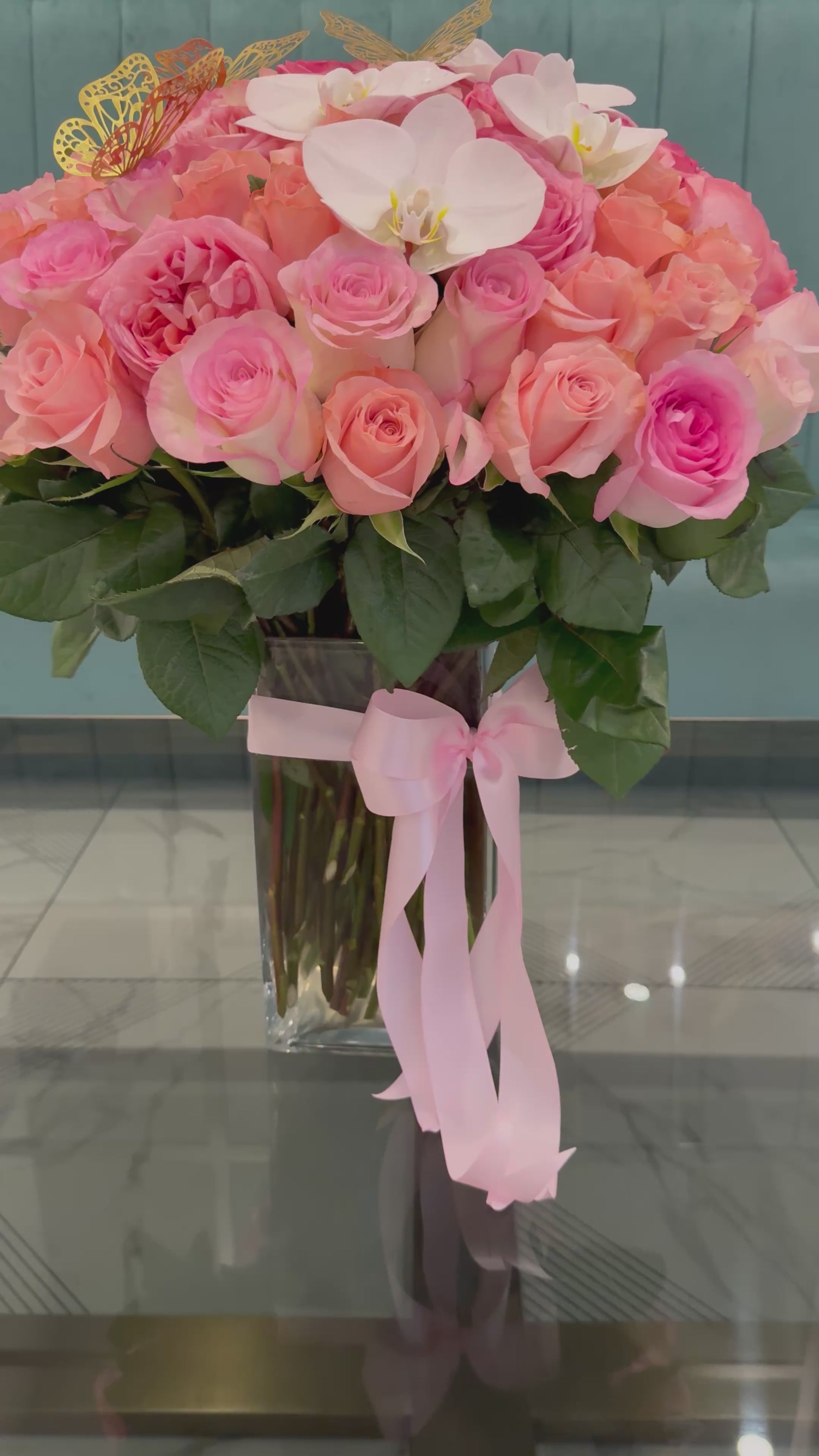 An abundant arrangement of 100 premium blush and pink roses, accented with elegant white orchids and adorned with delicate golden butterfly details. Presented in a clear crystal vase and finished with a soft pink ribbon.