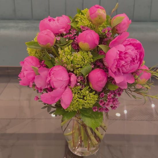 Heavenly Peonies is a graceful floral arrangement featuring 10 lush pink peonies, celebrated for their soft petals and romantic presence. Accented with fresh green hydrangea, delicate pink wax flowers, and natural foliage, each stem is thoughtfully designed in a clear glass vase that highlights the beauty of its organic form. This arrangement embodies elegance, softness, and heavenly charm—perfect for refined gifting and unforgettable moments.