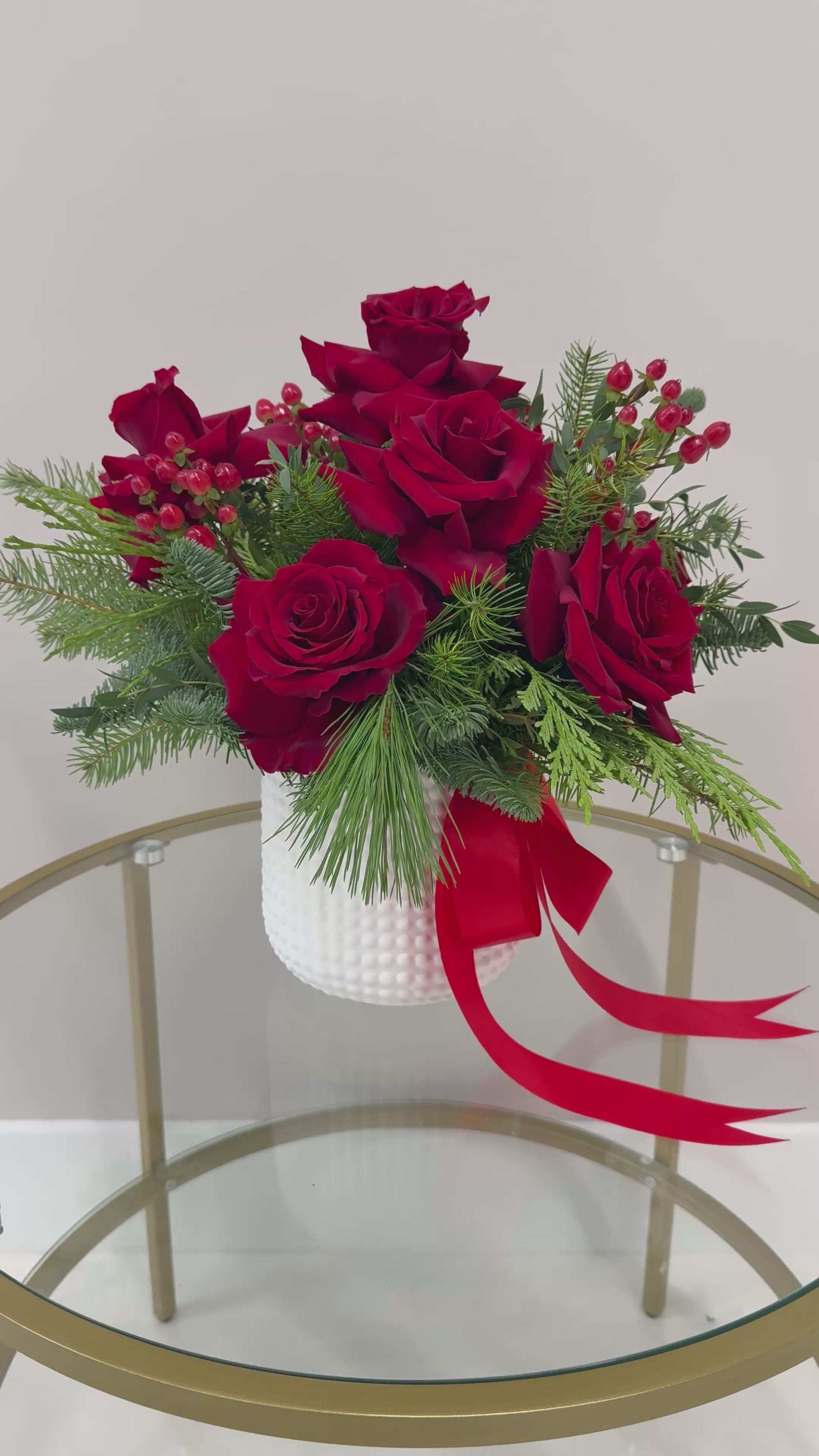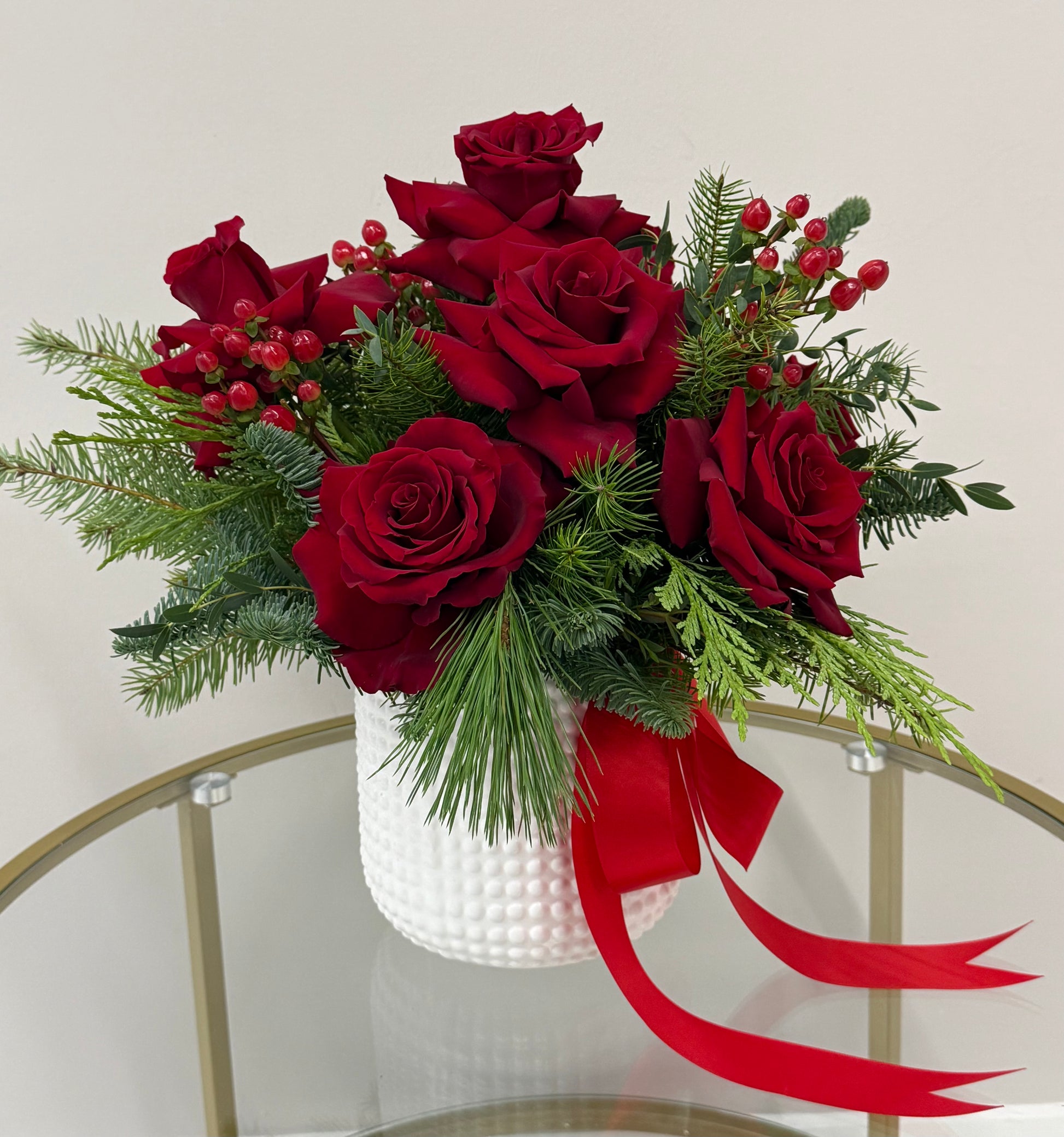 Celebrate the season with Holiday in Heaven, a luxurious floral arrangement featuring premium deep red roses gracefully surrounded by lush evergreen foliage and vibrant red hypericum berries. Designed in an elegant white textured vase and finished with a flowing red ribbon, this arrangement captures the warmth, romance, and timeless beauty of the holidays. Perfect for festive celebrations, meaningful gifts, or adding a touch of heavenly elegance to any space.