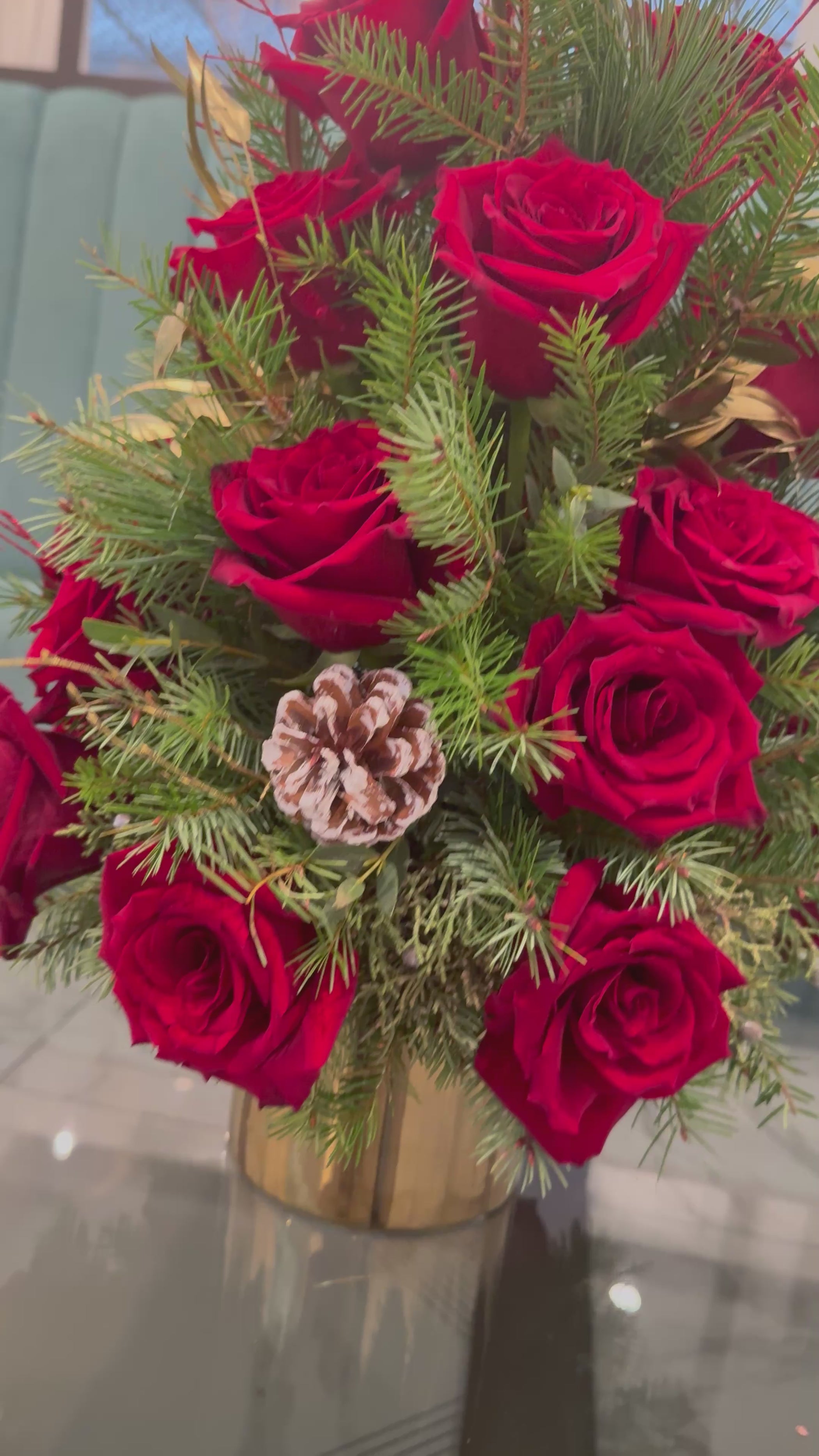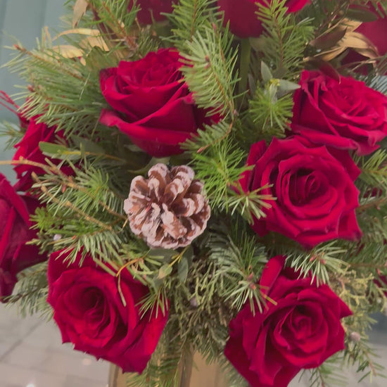 An exquisite Christmas arrangement that embodies the timeless elegance of the holiday season. Featuring luxurious red roses, carefully arranged among fresh evergreen pine foliage, this design captures the warmth, richness, and festive spirit of Christmas.