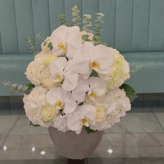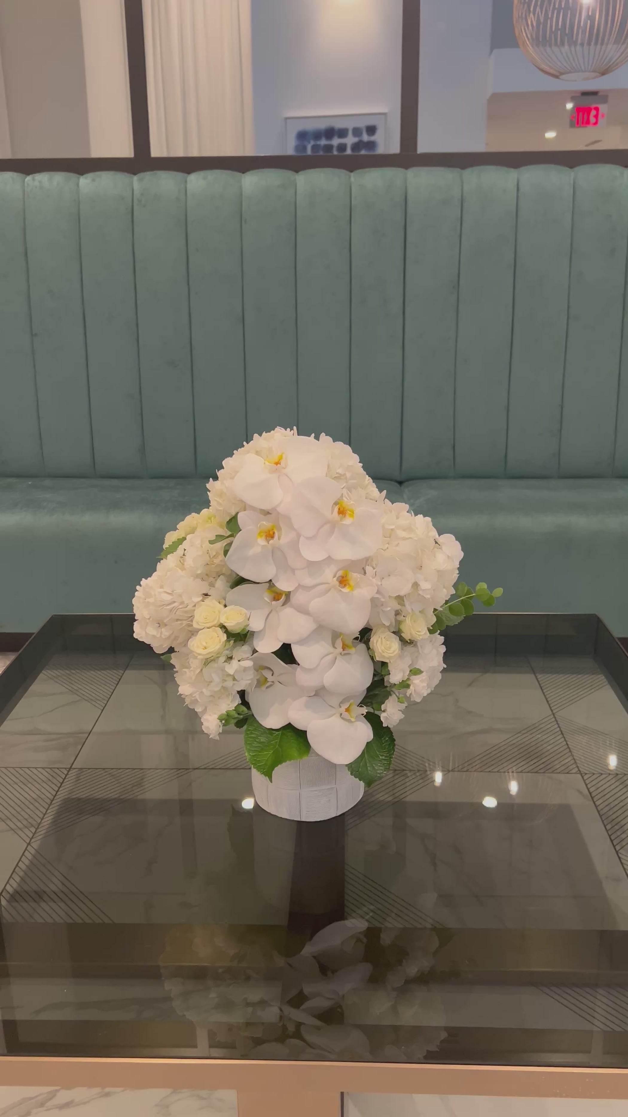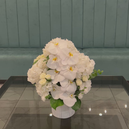 White orchids symbolize elegance, sophistication, and eternal love, while white hydrangeas represent harmony and renewal. Together, these flowers create a perfect combination that radiates style and serenity, ideal for adding a touch of luxury to any space.